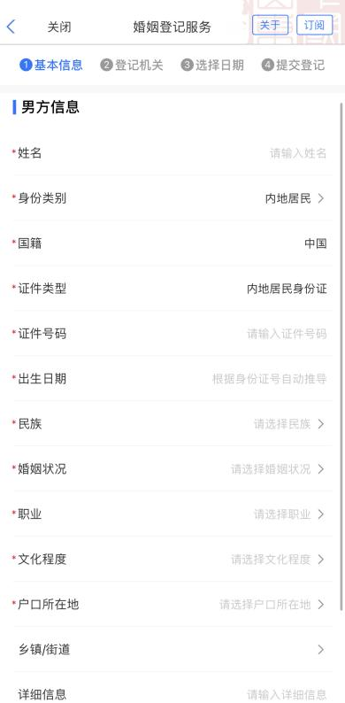 3、根据页面提示填写男方、女方信息,就近选择登记机关、预约日期及时段,上传相关附件,确认信息提交即可;