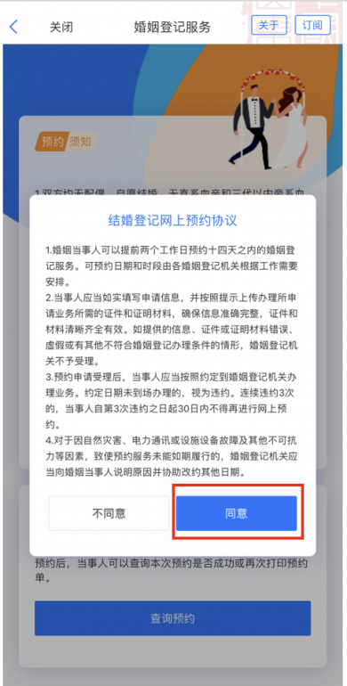 2、选择“结婚登记预约”,阅读预约须知并点击“我要预约”,同意结婚登记网上预约协议后,即可进入预约流程;