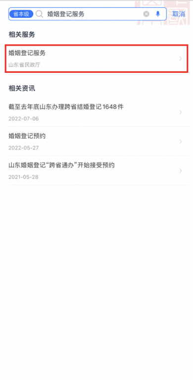 1、进入“爱山东”APP、支付宝、微信小程序,首页搜索“婚姻登记服务”,点击进入。