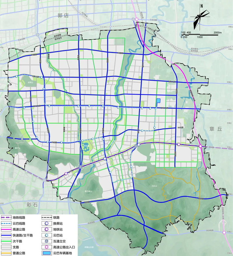 交通支撑,构建内畅外联的交通网络。强化系统融合的轨道交通体系,完善“两横一纵”快速路网和主干路网系统,实现10分钟上快速路,30分钟到达市政府、机场、济南东站;45分钟覆盖城区主要板块;60分钟到达济南西站。优化客货分离的城市道路网,打造活力渗透的完整街道体系,构建内畅外联的交通网络。